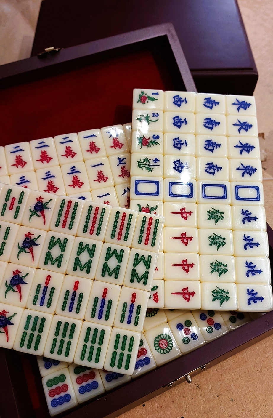 MahJong (travelling set) kept in a wooden case (box size: 20 cm X 12 cm cm X 6 cm); the tile’s size is 22.5 mm X 17 mm X 12 mm in ivory colours.
